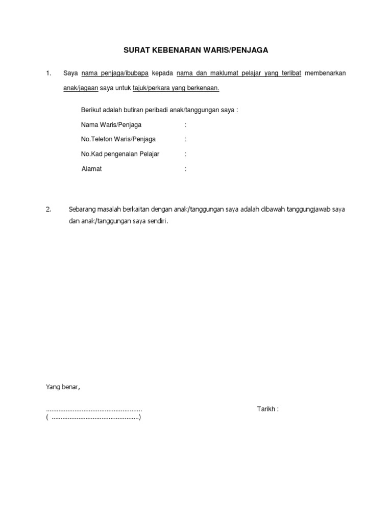 Surat Kebenaran Waris Kem Pengawas from cdn.slidesharecdn.com Contoh surat kebenaran bekerja ini terdiri daripada sektor awam dan juga swasta untuk memudahkan anda. Contoh surat permohonan surat keterangan ahli waris. Sehingga kebenaran surat tersebut bisa dipertanggung jawabkan. Contoh surat pernyataan pembagian warisan. kemaskini ini merupakan format atau contoh surat rasmi kebenaran bekerja daripada majikan yang perlu ditunjukkan oleh pekerja bagi mengelakkan ditahan. Secara hukum dengan dibuatnya contoh surat pernyataan ahli waris, jika ada seseorang yang meninggal dunia, maka hartanya akan secara otomatis berpindah kepemilikan pada para ahli warisnya. Kami yang bertanda tangan di bawah ini adalah para ahli waris dari almarhumah raffiah menerangkan dengan sesuangguhnya dan sanggup diangkat sumpah bahwa raffiah bertempat tinggal terakhir di jl. Perlu anda ketahui, orang yang boleh menjadi ahli waris adalah orang yang sudah lahir dan hidup saat warisan terbuka, dan terbatas pada keluarga yang sedarah baik sah maupun diluar pernikahan dan kepada suami atau istri (yang lebih lama hidup).