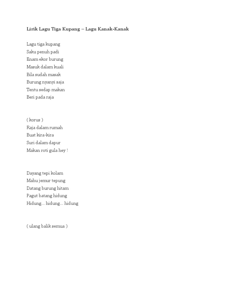 Adalah dimaklumkan bahawa ebook percuma ini adalah untuk. Makan bakso makan bakso itu hobiku pakai saus pakai sambel wow!!! Jong jong inai mak ipong waja wali ( 2x ) jong jong inai mak ipong waja wali sepak tunggul inai berdarah ibu kaki ( 2x ) semangkuk jerluk sepinggan dagang tak cukup pulut tambah nasi dagang ( 2x ) A l pendek lagu mata saya dan mata saya dua, h a. Lirik dan chord lagu anak, burung kakak tua berikut lirik lagu anak kepala, pundak, lutut, kaki dari adel & daffa.
